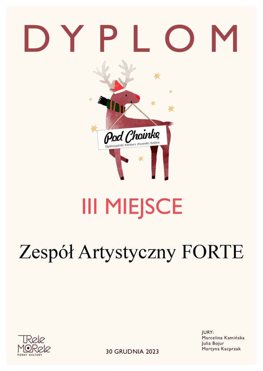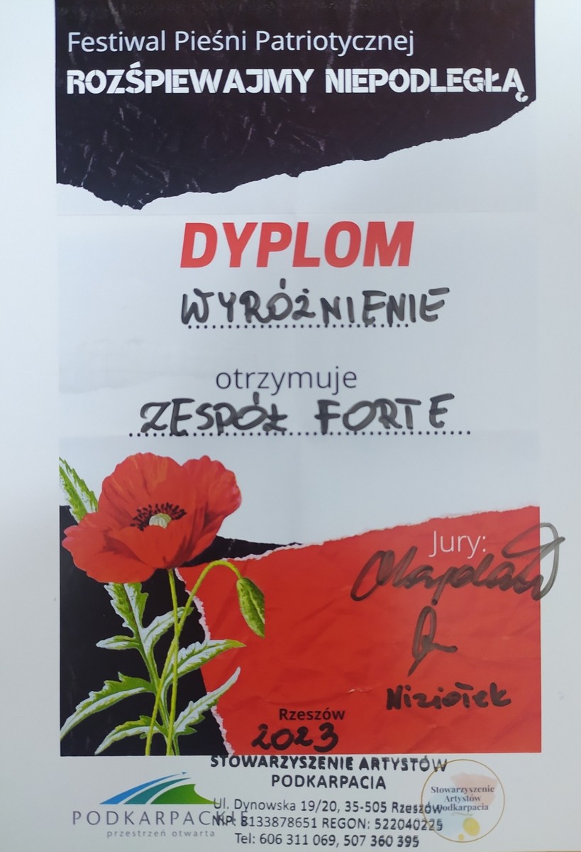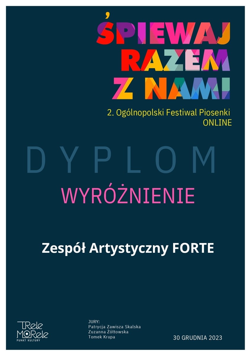 W ciągu minionego roku ZA FORTE zajął III miejsce w Ogólnopolskim Konkursie Piosenki „Pod Choinkę”. Ponadto został finalistą i otrzymał wyróżnienia w Międzynarodowym Festiwalu Piosenki Świątecznej i Zimowej „Hu, Hu, Ha!” 2023 oraz II Ogólnopolskim Festiwalu Pieśni Patriotycznej „Rozśpiewajmy niepodległą” a także w Ogólnopolskim Festiwalu Piosenki „Śpiewaj razem z nami”.