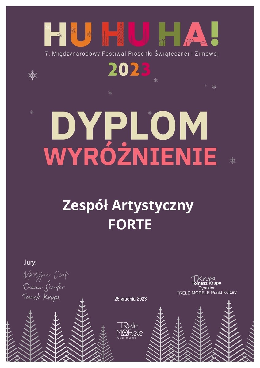 Rok 2024 niesie ze sobą kolejne wyzwania, dziesiątki prób, występy, festiwale, konkursy. Mamy nadzieję, że będzie on równie owocny jak rok ubiegły. Wszystkich sympatyków ZA FORTE zapraszamy do śledzenia naszych mediów społecznościowych. Serdecznie dziękujemy tym osobom, które do tej pory trzymały za nas kciuki i przyczyniły się do rozwoju oraz osiągnięć całego ZA FORTE.